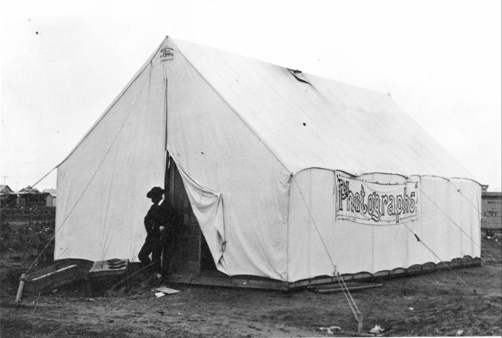 - Clarence E. Bisbee posing in front of his photography tent studio.