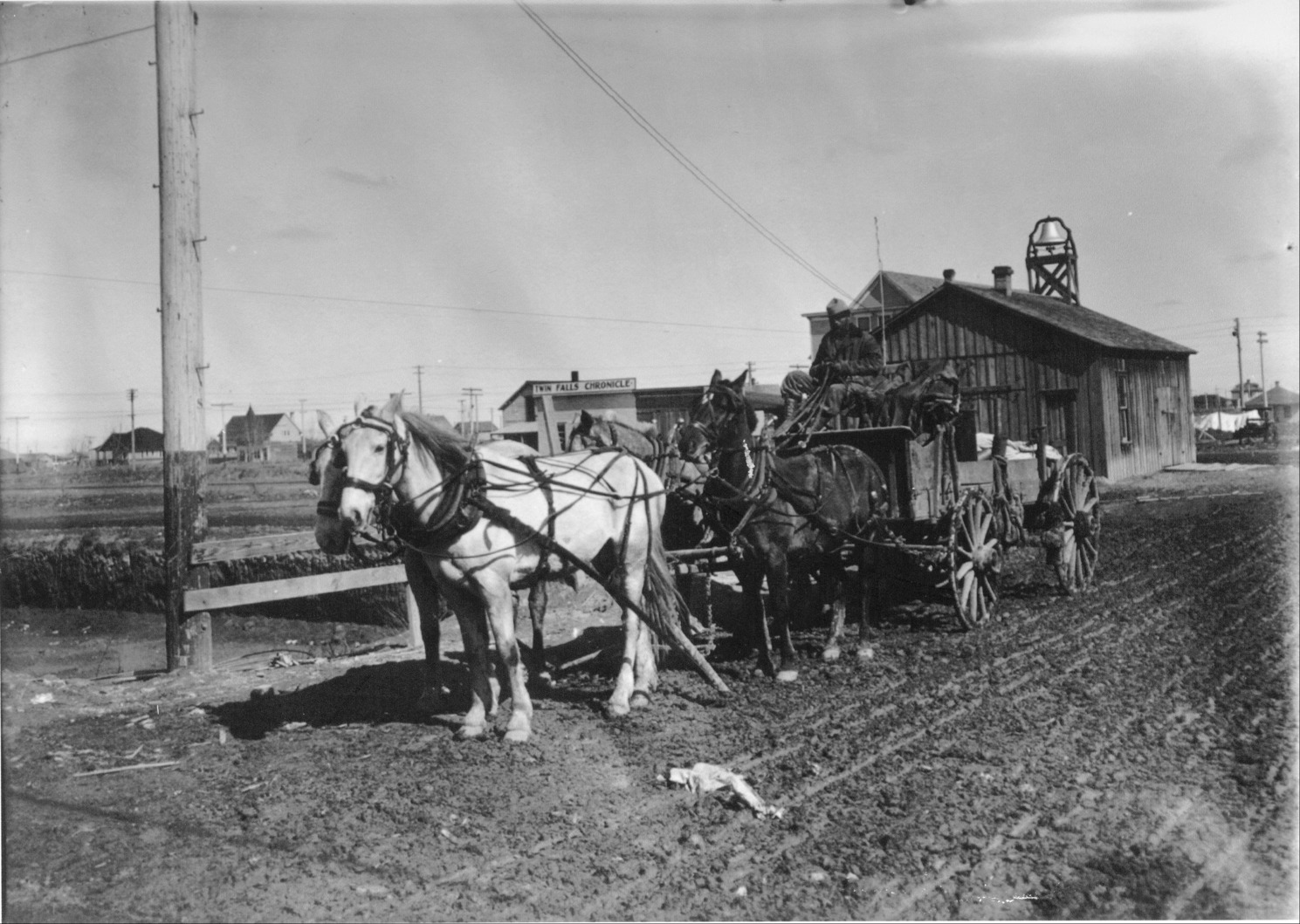 - A freight wagon pulled by four horses, stands along a muddy Twin Falls street. The first fire station, with the bell attached to the roof is directly behind the wagon. The Twin Falls Chronicle Newspaper building and other houses and buildings are also visible.