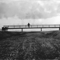 - A man stands on a low bridge over a canal. A two-horse buggy is on the berm to the left.
