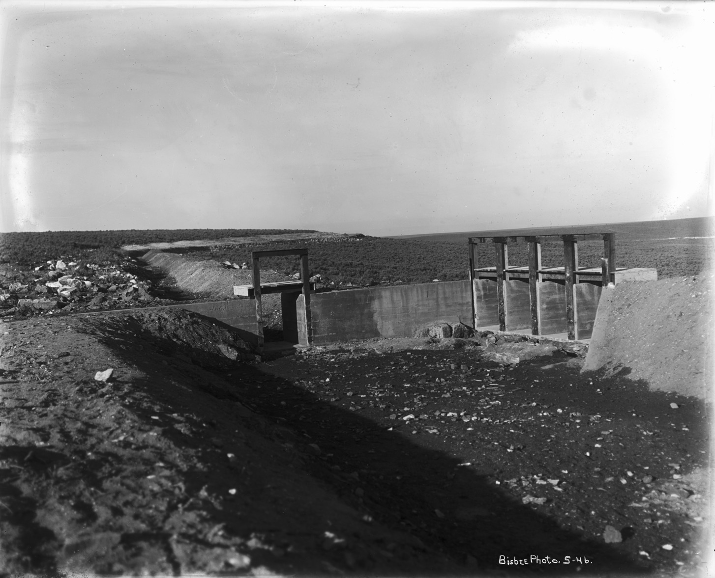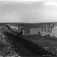 - Wide view of canal system across sage brush plain, with gates in the foreground.