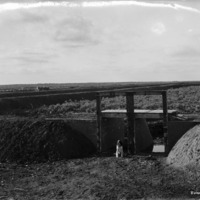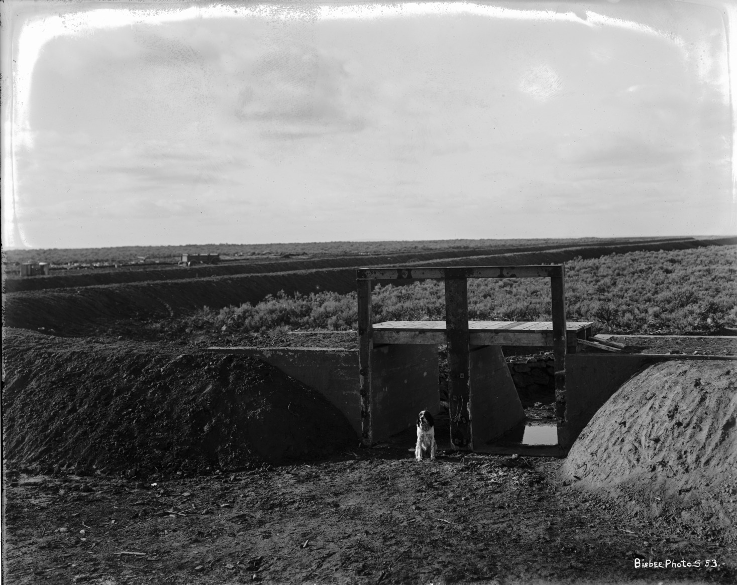 - A dog stands beneath a canal gate in a dry channel. A wagon is in the background.