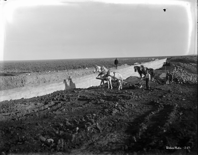 - Wide view of teams of horses and crews constructing a section of a canal. One man stands atop a concrete wall.