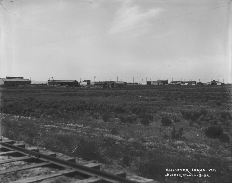 - "Hollister, Idaho - 1911;" wide view ot Hollister taken from the railroad tracks.