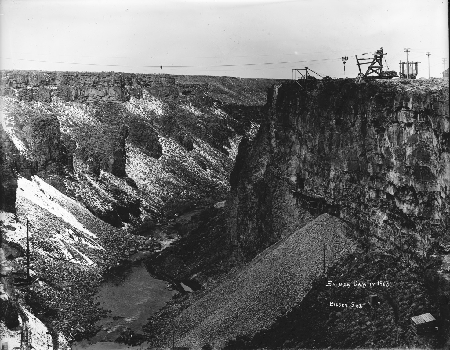 - "Salmon Dam in 1908;" view looking into the canyon where the dam is beginning construction; equipment on right.