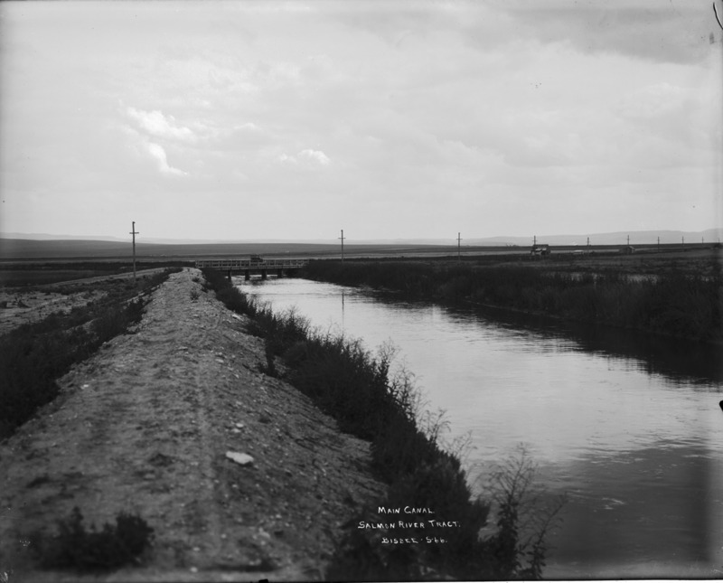 - "Main Canal. Salmon River Tract;" look down a canal and berm toward a bridge; automobile (car) stopped on bridge. House and outbuildings on left background.
