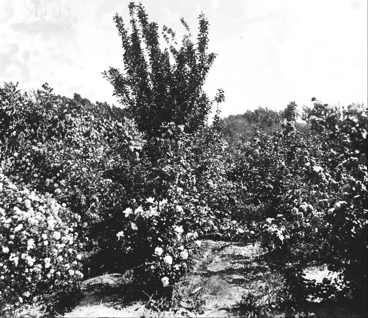 - Rose bushes in bloom.