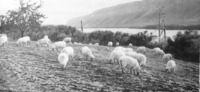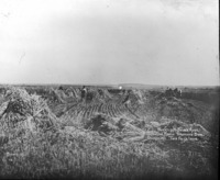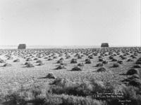 2078 "Third cutting of alfalfa. C.E. McClain, Twin Falls, Idaho;" field with small piles of alfalfa. Two large stacks of hay/alfalfa in the background. -