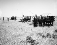 2042 "Wheat, 77 2/3 Bushels Per Acre. Schwamb Ranch. Turnipseed Brothers, Overseers, Twin Falls, Idaho;" Two men and a team of horses operating a reaper-binder in a wheat field. -