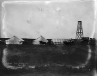 B 106 "A Camp, Construction, 1909; North Side;" men and teams of horses with buggies stand among several large canvas tents