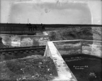 B 107 "Siphon Under R.R., North Side;" a man in a horse-drawn buggy is parked on a lane near the siphon that goes beneath the railroad tracks.
