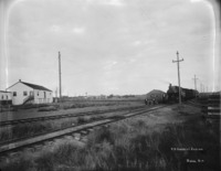 B 010 "Railroad yards at Jerome;" train, with people posed at the front of the engine, in the Jerome railroad yard; several buildings in the background