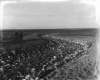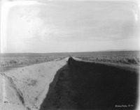 S 048 Wide view of a dry canal traversing the sage brush; a two-horse buggy stands in the dry canal bed in the center.