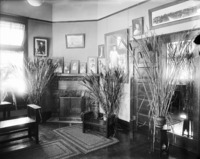 1699 Interior of Bisbee Studio. Ferns in vases and fireplace are visible.