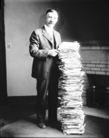 1698 Clarence E. Bisbee standing beside a stack of newspapers and other papers, fireplace in background.