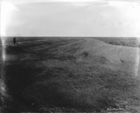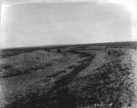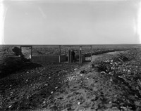 S 031 A man in a two-horse buggy stops on a berm beside a dry canal. Gates are in background.