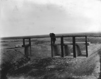 S 029 A man in a two-horse buggy stops on a berm beside canal gates. The canal bed is dry.