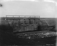 S 027 A man (possibly Clarence Bisbee) stands along concrete dam in a canal system.