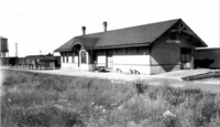 GB 061 Railroad station (depot) at Buhl. A water tower and a smaller outbuilding at left; several rail cars on tracks behind station.