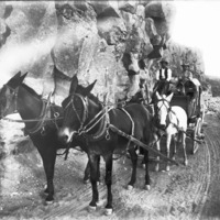 - Two men seated on a stagecoach pulled by a team of four horses, descending a road into the canyon.