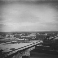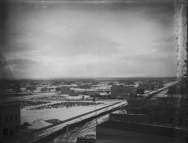 View of early Twin Falls townsite showing streets and new construction; likely taken from atop the Hotel Perrine. Visible signs are Young's Grocery and Seed House (bottom left) and Burrington Hotel (middle right).