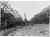 1939 Men, teams of horses, and a construction derrick in a canal channel.