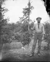 1948 A man standing beside a young tree in a grove, holding a measuring pole to display growth.