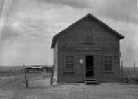 1936 A frame building identified as Post Office; a rough-hewn hitching post stands at left, and a low-slung barn or other outbuilding in the background. Possibly at Rock Creek (one of the signs reads "Rock Creek, July 4").