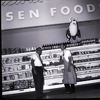KEL 666 Two men stand in front of some refrigerated shelves of food at the Safeway grand opening. One of the men is wearing a long apron. An inflatable cow hangs from ceiling above them.
