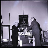 KEL 659 Arranging collars and aprons for the opening of the 99th Annual Communication of the Grand Lodge of Idaho are W. G. Pyrah, grand marshal, left, and A. T. Kauffman, right. A banner above their display reads "Grand Lodge A. F. and A. M. of the State of Idaho." Two chairs sit in front of the display. A flag stands to the side of the stage.