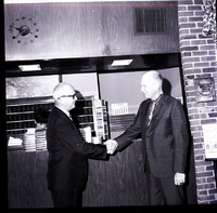 KEL 660 Two men dressed in suits and ties shake hands in the front lobby of a Holiday Inn at an Idaho Masons convention. Behind them is the front desk, and a woman works behind it. A clock is on the wall above them.
