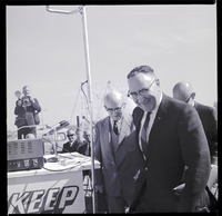 KEL 656 Dan Cavanagh, pioneer builder and contractor for the Hansen suspension bridge, is followed by Ellis Mathes, state highway engineer, at the Hansen Bridge Dedication. They are dressed in suits and ties walk beside the KEEP radio stand. Another man follows behind them, and several other men are seated in folding chairs on the stage. In the background is a man standing up with a large camera to take a picture of the event.