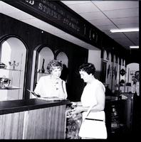 KEL 654 A woman stands at the counter looking over a stamp booklet during the grand opening of the new Gold Strike Stamps store on Addison Avenue in Twin Falls. Manager Mrs. Glen Simmons stands behind the counter. Behind her are shelves filled with silver kitchenware, candle holders, vases, and other household decorations. In the glass display case of the counter are glassware and other household items. A man watches in the corner. Above them a sign reads "Families Live Better Gold Strike Stamps."