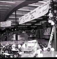 KEL 664 From left to right, Dick Anderson, merchandiser, and Ted Gardner, stocker, hang up a string of balloons on the side of a banner for Safeway's grand opening. The visible part of the banner reads "Idaho, Our Grown is Shown." Behind the men is a ladder, and at their feet is a pile of balloons. The deli section can be seen in the background under a large sign reading "Meats," and streamers hang over the deli counter.