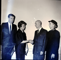KEL 613 Probate Judge Zoe Ann Shaub, second from left, and Judge O. P. Duvall, third from left, shake hands after Judge Shaub was reinstalled as chairman of the Salvation Army Advisory Board. At left is Rev. R. Lewis Graham, special speaker at the annual meeting, and at the right is Salvation Army Major Marie Anderson. The men are wearing suits and ties, Judge Shaub is wearing a dress suit, and Major Anderson is wearing a Salvation Army uniform.