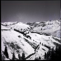 KEL 619 An aerial photograph shows the snow covered slopes at Sun Valley where the American International Team skiing races were held. A road winds around the side of a slope, and pine trees cover the landscape.