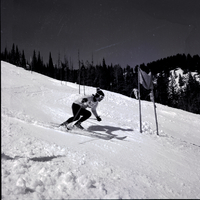 KEL 618 Skiers race downhill in the American International Team skiing races held at Sun Valley. Several skiers weave between slalom poles on a snow-covered slope. Pine trees line the sides of the slope.