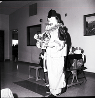 KEL 612 Tony Laughton, brother of late actor Charles Laughton, performs a benefit show sponsored by the Twin Falls Jaycees at Robert Stuart Junior High for students of the special education class. He is dressed as a clown. Behind him is a table covered in various props. A still life painting hangs on the back wall.
