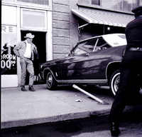 KEL 622 A driverless car careened across Shoshone Street West to straddle a parking meter in the middle of the sidewalk outside of Red's Trading Post. Phillip Cargill, owner of the local Hertz Rent-A-Car agency, stepped out of the car, apparently while the vehicle was still in gear, and returned to find it rolled onto the sidewalk. He is dressed in a cowboy hat, jacket, slacks, and boots, and stands outside the shop, looking at the automobile accident. A policeman stands at the back of the car.