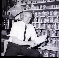 KEL 621 Rudy Ashenbrener, commanding officer of the local Air Force reserve unit, sits on a stool looking at a spiral-bound book in Price Hardware after returning from a tour of Air Force and NATO installations in Europe with the United States Air Force. He is dressed in a shirt, tie, and slacks. Behind him are several shelves holding cans of paint, and a display sign hangs on the wall reading "Sherwin-Williams Colormeter for accurate color mixing!"
