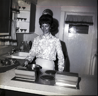 KEL 616 Making a favorite dish for her family is Mrs. Larrey Anderson, representative from the Magic Valley in the Mrs. Idaho contest in Pocatello. Sponsoring the local contest was KLIX Radio Station and Gold Strike Stamps. Mrs. Larrey Anderson stands behind a stove in a kitchen. A pot sits on one of the stove burners. To the side of the stove is a large bowl of fruit. In the back of the kitchen some cupboards, shelves holding glasses, a sink, and some glass bottles sitting on the counter are visible. In the back of the room is a door, and a decorative plate hangs on the back wall.