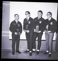 KEL 590 FFA contest winners at the west Magic Valley District FFA Contest held in Gooding display their award trophies. From left to right are Twin Falls FFA members David Sommer, David Coffelt, Michael O'Dell, and Donald Montgomery. They are dressed in suits and ties and their embroidered FFA jackets. In the classroom behind them is a projector drape and a blackboard.