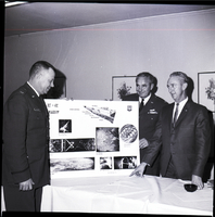KEL 588 New Wing Commander at the Mountain Home Air Force Base, Col. Robert Williams, left, points out topics of his talk on RF-4C imagery to Col. Rudy Ashenbrener, commander of the 9430th Air Reserve Squadron, and Lt. Col. Harry LeMoyne, president of the Magic Valley Chapter of the Air Force Association, at an Air Force Association meeting held in Twin Falls. The poster shows the different locations of the sensors on the aircraft, and several photographs taken from the aircraft. Col. Williams and Col. Ashenbrener wear their military uniforms, and Lt. Col. LeMoyne is dressed in a suit and tie. Behind the men are framed illustrations of flowers hanging on the wall. The poster is sitting on a table covered in a white tablecloth and with an ashtray on it.