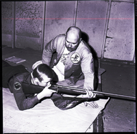 KEL 584 Boy Scout Steve Nutting, from Troop 42 in Kimberly, receives gun instruction from Chris Fearheller Jr. at the Twin Falls Gun Club to qualify for a badge. Mr. Fearheller is wearing a jacket with a Winchester patch on the front, and Steven Nutting is wearing his scout uniform.