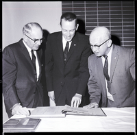 KEL 581 Board of Directors officers for the YMCA look over a YMCA scrapbook. From left to right are John B. Sims, secretary, Gordon Cox, president, and Howard Burkhart, treasurer. They are dressed in suits and ties. On the desk is a plaque.