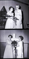 KEL 550 In the top image, Mrs. Margaret Harrell, grand guardian of Idaho, International Order of Job's Daughters, admires the beautiful bouquet of roses held by Mrs. Mary Etta Wright, supreme guardian. In the background behind them is a Biblical display. A folding chair sits in the corner. In the bottom image, Connie Van Ostran, honored queen of Bethel No. 43, hands Mrs. Mary Etta Wright the bouquet of roses. Behind them is a large white cross.