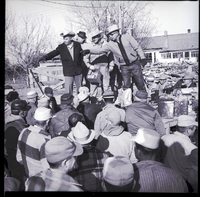 KEL 556 Auctioneers Harold Klaas, left, and Joe Duffek, point to one of several bidders seeking a box full of assorted cans. The accumulated equipment from more than forty years of farming by the late Howard Lapray was sold at auction at his estate's farm sale, north of Filer. The auctioneers stand on a platform, dressed in coats and cowboy hats, and a crowd of men surround it. A house and some trees are in the background.
