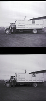 KEL 540 Harry Knigge, sanitation company foreman, and Chad Thompson, city sanitation inspector, stand beside new garbage trucks owned by the Eldon Corporation. A house and a tree are seen in the background.
