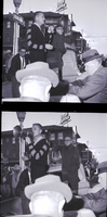 KEL 539 United States Senator Len Jordan speaks at a joint meeting of the Twin Falls County Republican Women and Petticoat Pollys held at the American Legion Hall in Twin Falls. He is dressed in a suit and tie and stands behind a podium. A woman is seated at the table beside him, and cups, a coffee pot, ash trays, a pitcher, and an elephant decoration are on the table. A man is sitting at the side of the room. On the stage behind them is a piano and some flags.