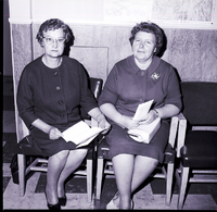 KEL 536 Mrs. A. B. Paris and Mrs. Laura Holman are winners in the Thanksgiving drawing sponsored by Twin Falls downtown merchants. Mrs. Paris won the first place prize of $100 worth of merchandise and Mrs. Holman won the last place prize of $25 worth of merchandise. The two women are wearing dresses, and they are seated and are holding their award certificates in their laps. A map of Idaho is on the wall behind them.