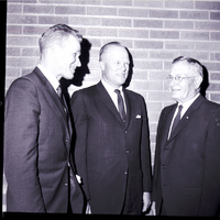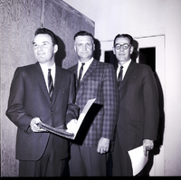 KEL 519 Three men discuss college campus sites following an area site committee meeting at the College of Southern Idaho Vocational School. From left to right are Charles L'Herisson, who represented three Jerome groups at the meeting; William D. Wiseman, member of the CSI board of trustees and chairman of the area site committee; and Jack Shaw, who spoke for three Twin Falls groups during the meeting. They are all dressed in suits and ties. Mr. L'Herisson is holding a binder, and Mr. Shaw is holding some papers.